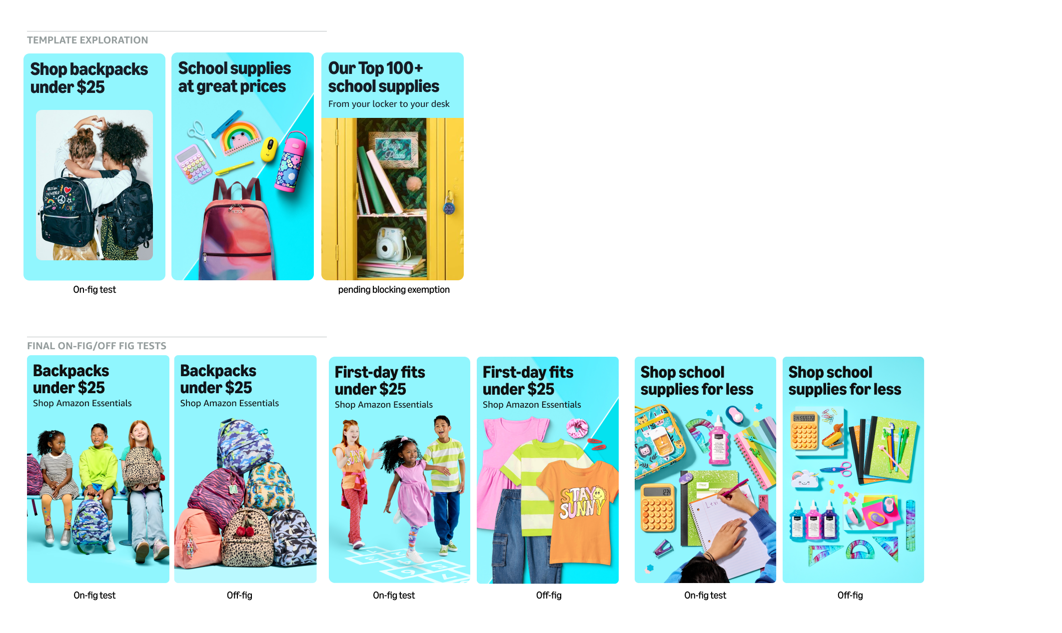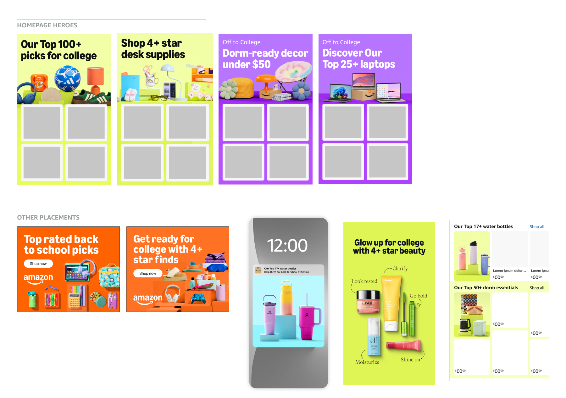 Prior to design kick off with the production team, I partnered with our Associate Creative Director to explore designs and photo shoot direction options utilizing a style guide created by the Amazon Global brand team (XCM). We went through 4 rounds of exploratory designs, ultimately landing on testing on-figure and off-figure creative for 3 top stories for Back to School (BTS) while maintaining layouts approved by XCM.