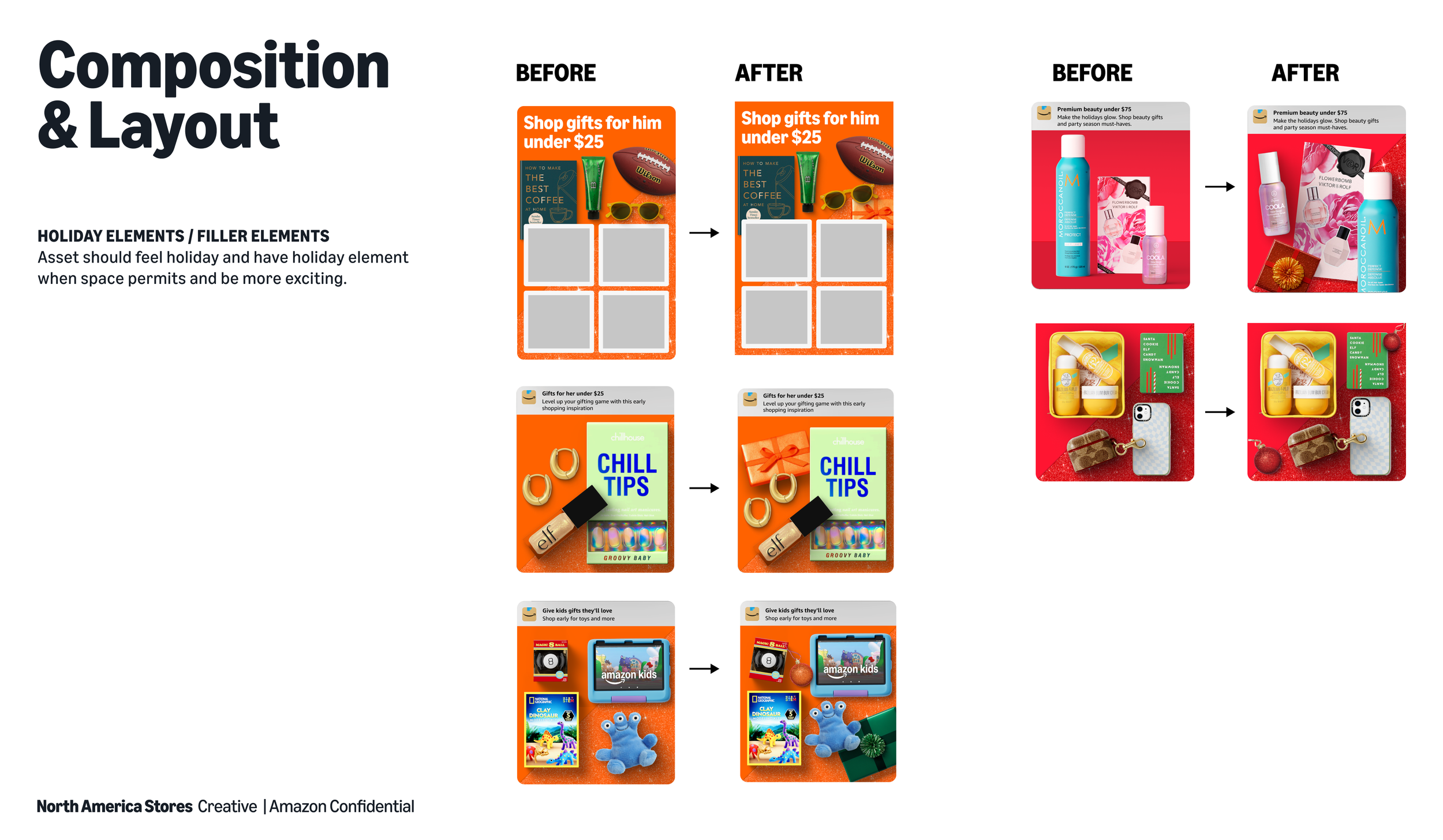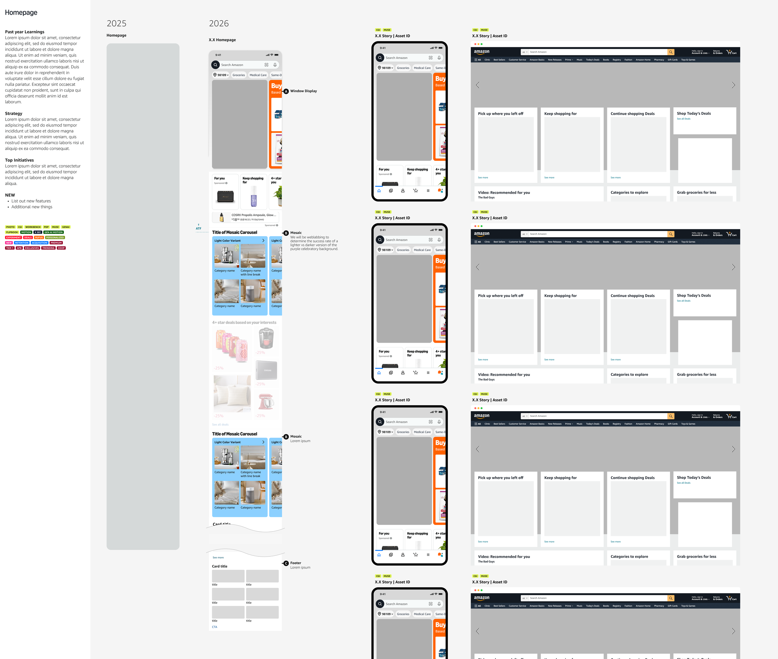 Through my role as design lead for seasonal events on the North American Stores team at Amazon for the last 2 years, I’ve identified gaps and made process improvements to help simplify events, reduce rework and churn, while raising the design bar. Our creative review process was repetitive with condensed timelines that made it difficult for the design team to make all edits and updates between reviews. I partnered with two of my project managers to discuss pain points, adjust timelines and get alignment with our creative director and marketing lead. We reduced reviews 15%, establishing clear expectations and outcomes for each review. This updated cycle allowed us to meet all deadlines without losing design time.